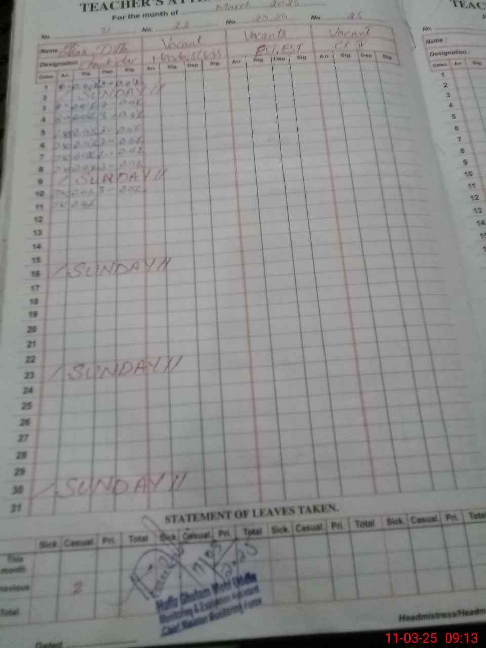 | 38**** | Ta**** Ya**** | Regular | 2 | 0 | 0 | 0 | 0 | 0 | 0 | 0 | 2 | Exam Duty | |