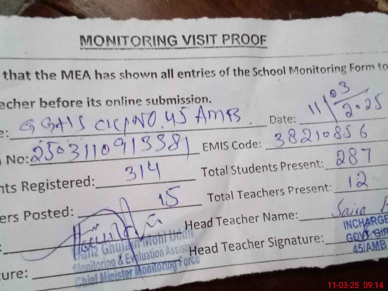 | Attendance Register | Head Teacher | MEA with School | Visit Proof |