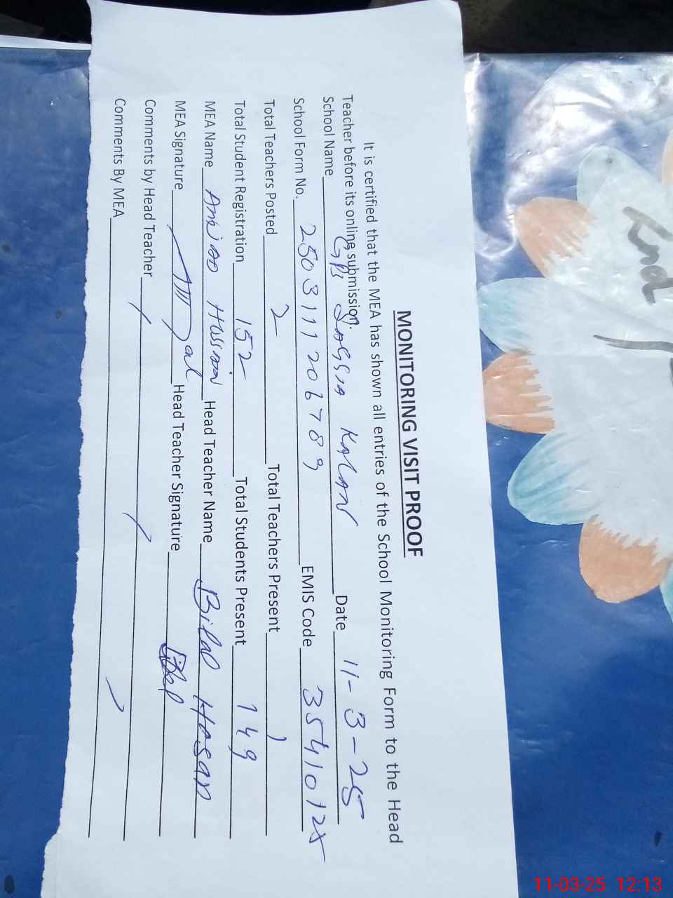 | Attendance Register | Head Teacher | MEA with School | Visit Proof |