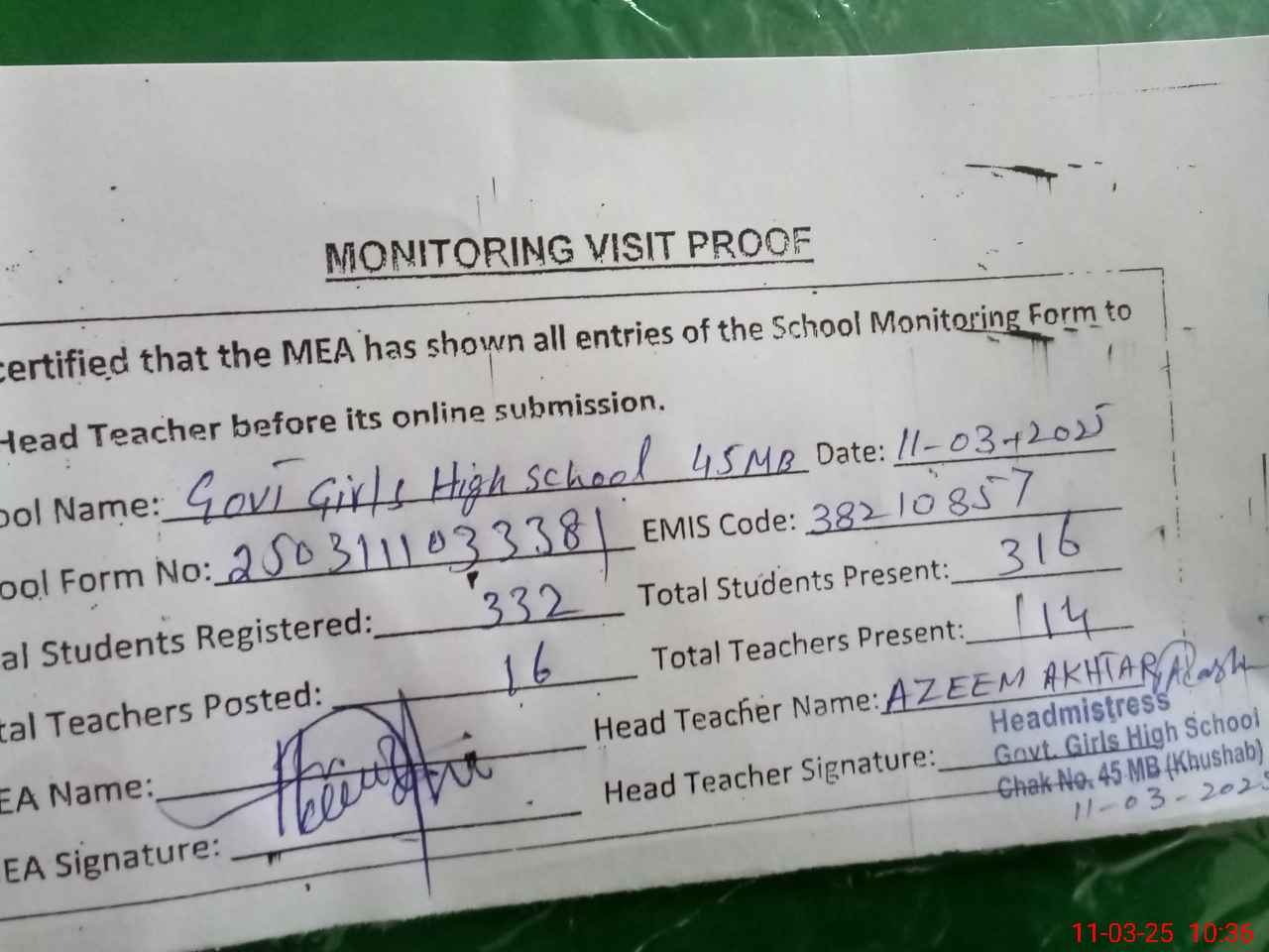 | Certified that this School was Inspected by the Undersigned MEA/DMO Today and the Information Stated Above is as Per Record. | |||||