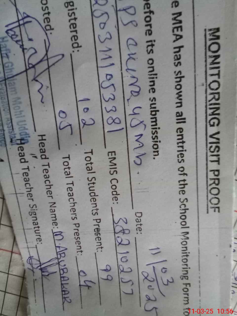 | Attendance Register | Head Teacher | MEA with School | Visit Proof |