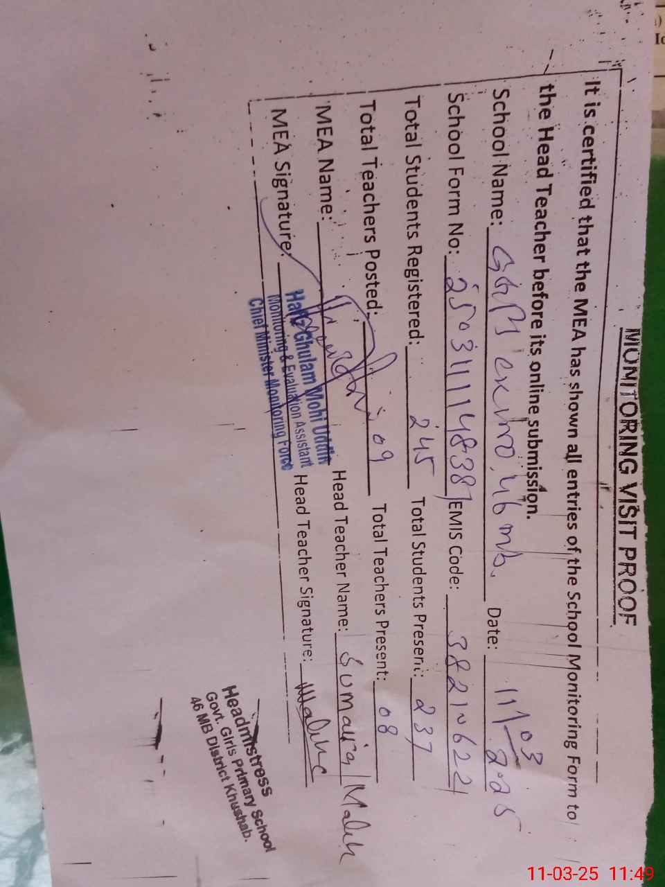 | Certified that this School was Inspected by the Undersigned MEA/DMO Today and the Information Stated Above is as Per Record. | |||||