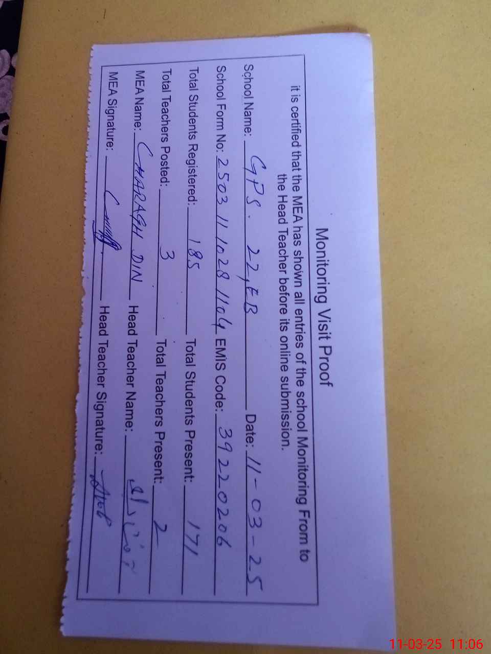 | Attendance Register | Head Teacher | MEA with School | Visit Proof |