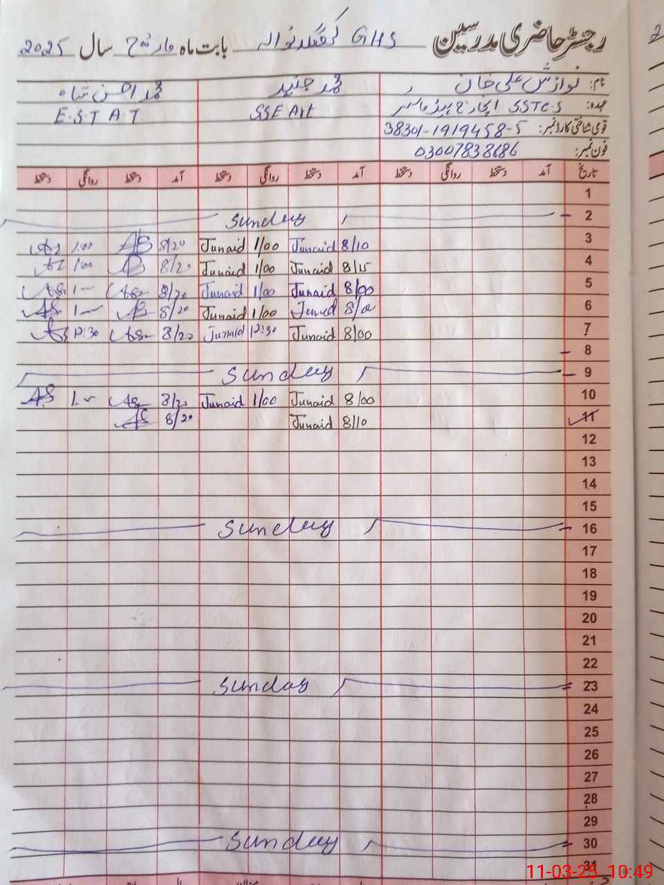 | Name: NA**** AL**** KH**** Designation: (School Headmaster's/Headmistress's) SST( C/ S ) Phone/Cell Number: 03**** |