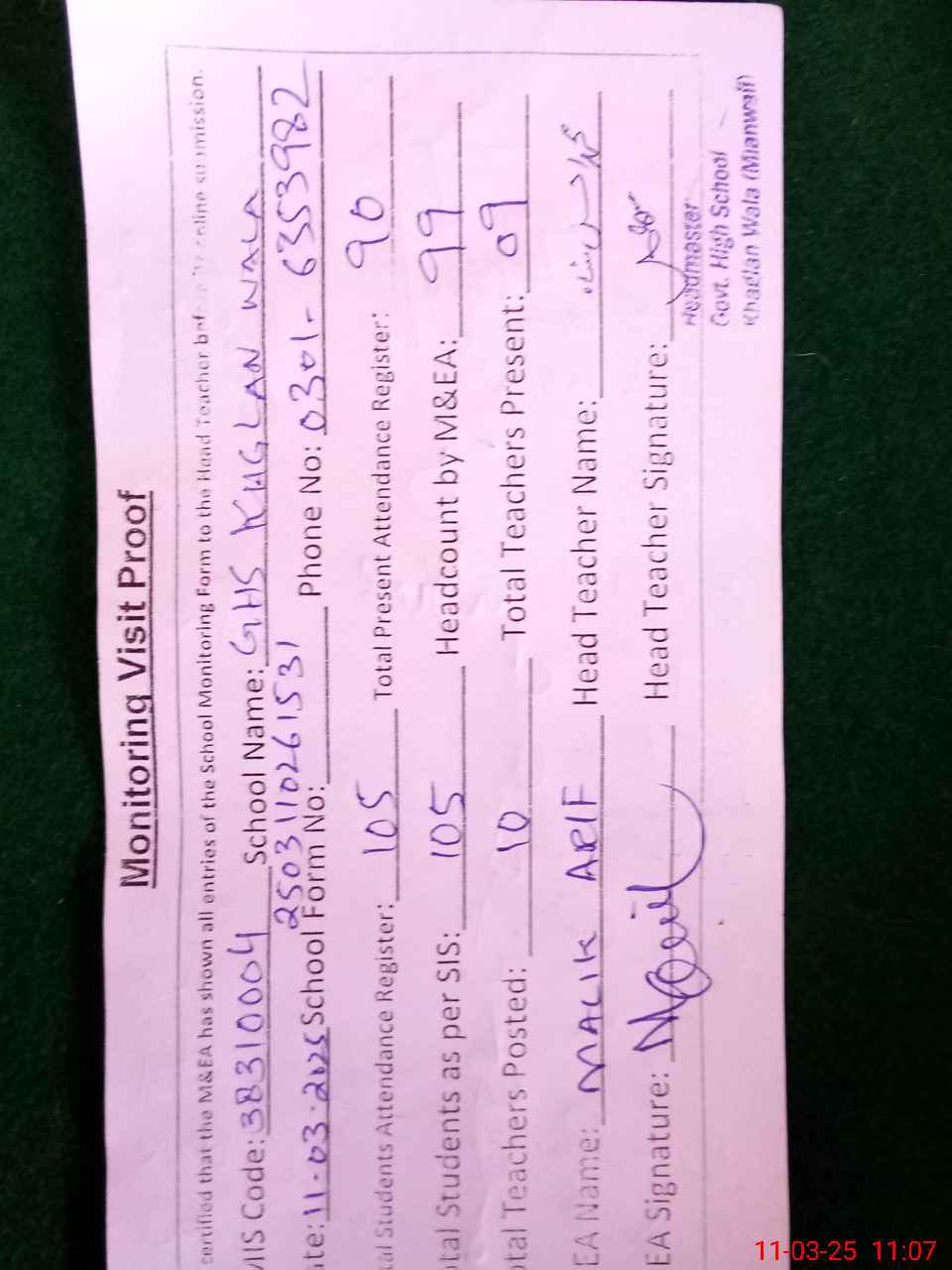 | Remarks (Use Separate Page if Required): Teacher Mr Shafi Ullah EST marked as absent as he is on earned leave since 18th February 2025 however his online leave is still waiting for approval by the authories concerned No soap on wash point Very poor condition of the school building overall | |||||