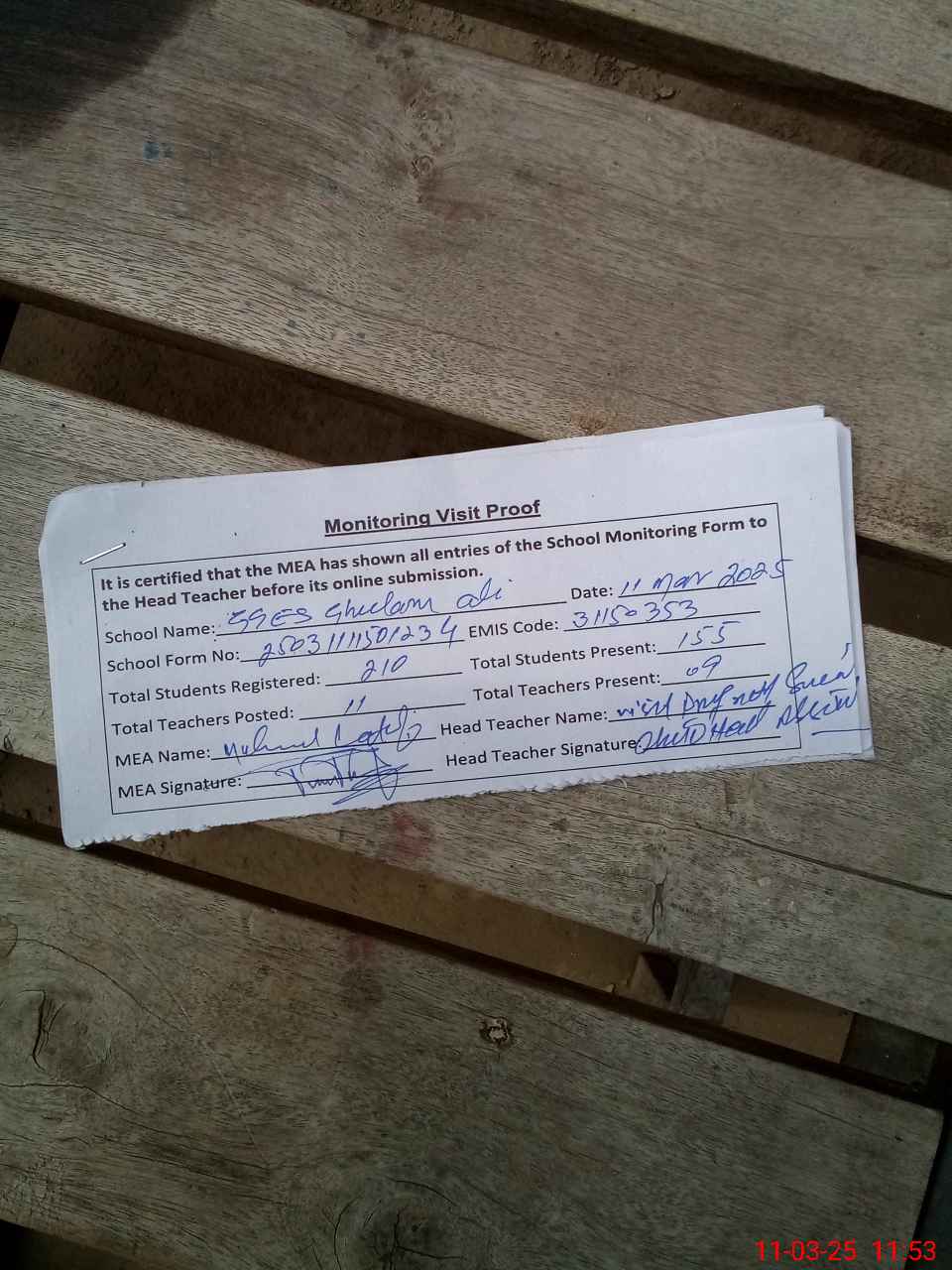 | Attendance Register | Head Teacher | MEA with School | Visit Proof |