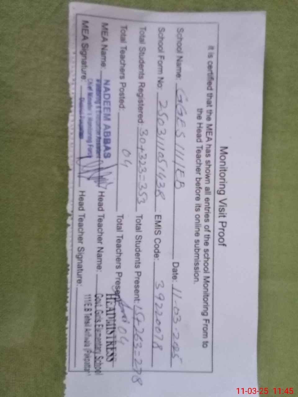 | Attendance Register | Head Teacher | MEA with School | Visit Proof |