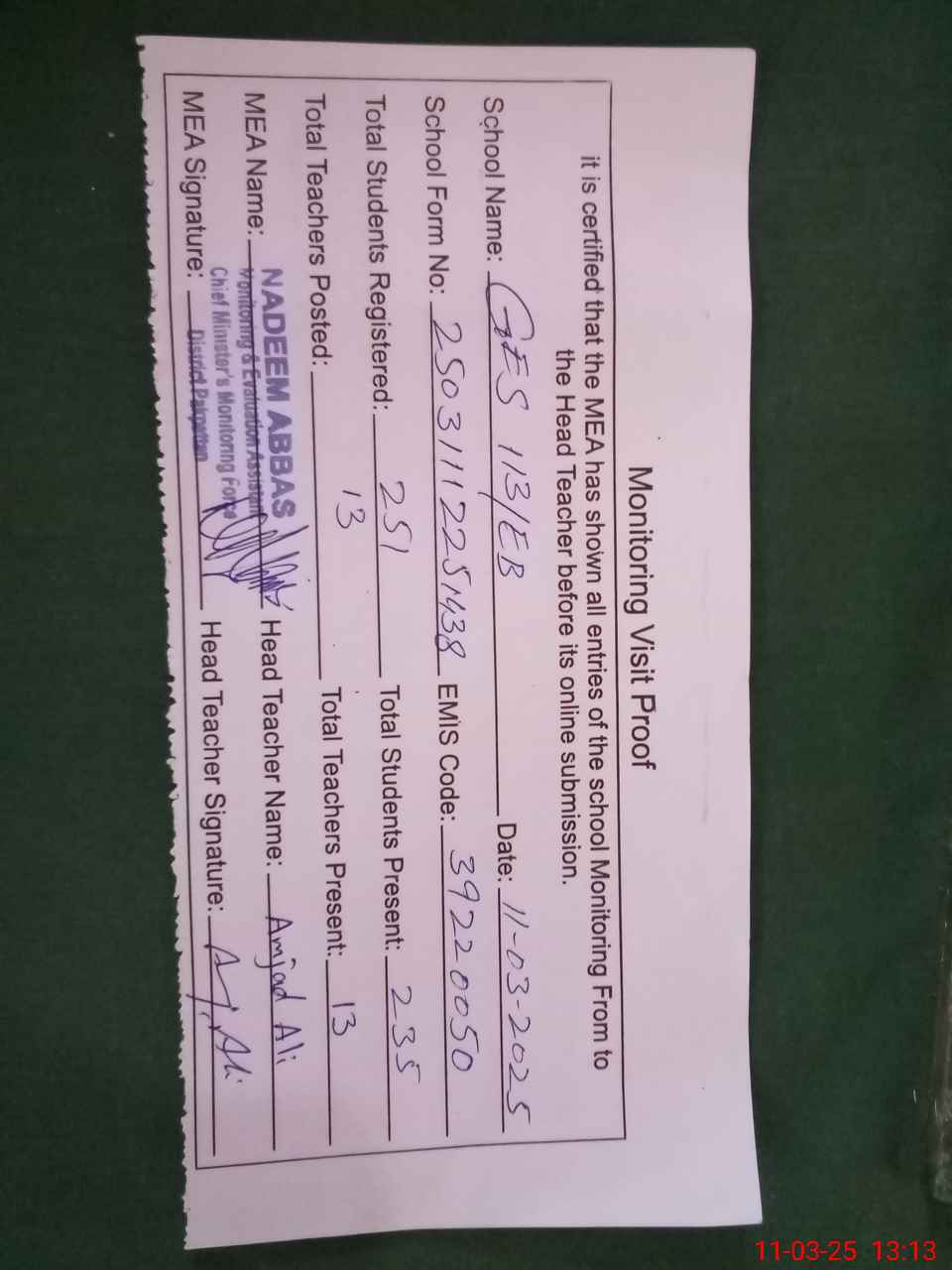 | EMIS Code: 39220050 | Name of School: GES 113 EB P/O 111 EB ARIFWALA | |||