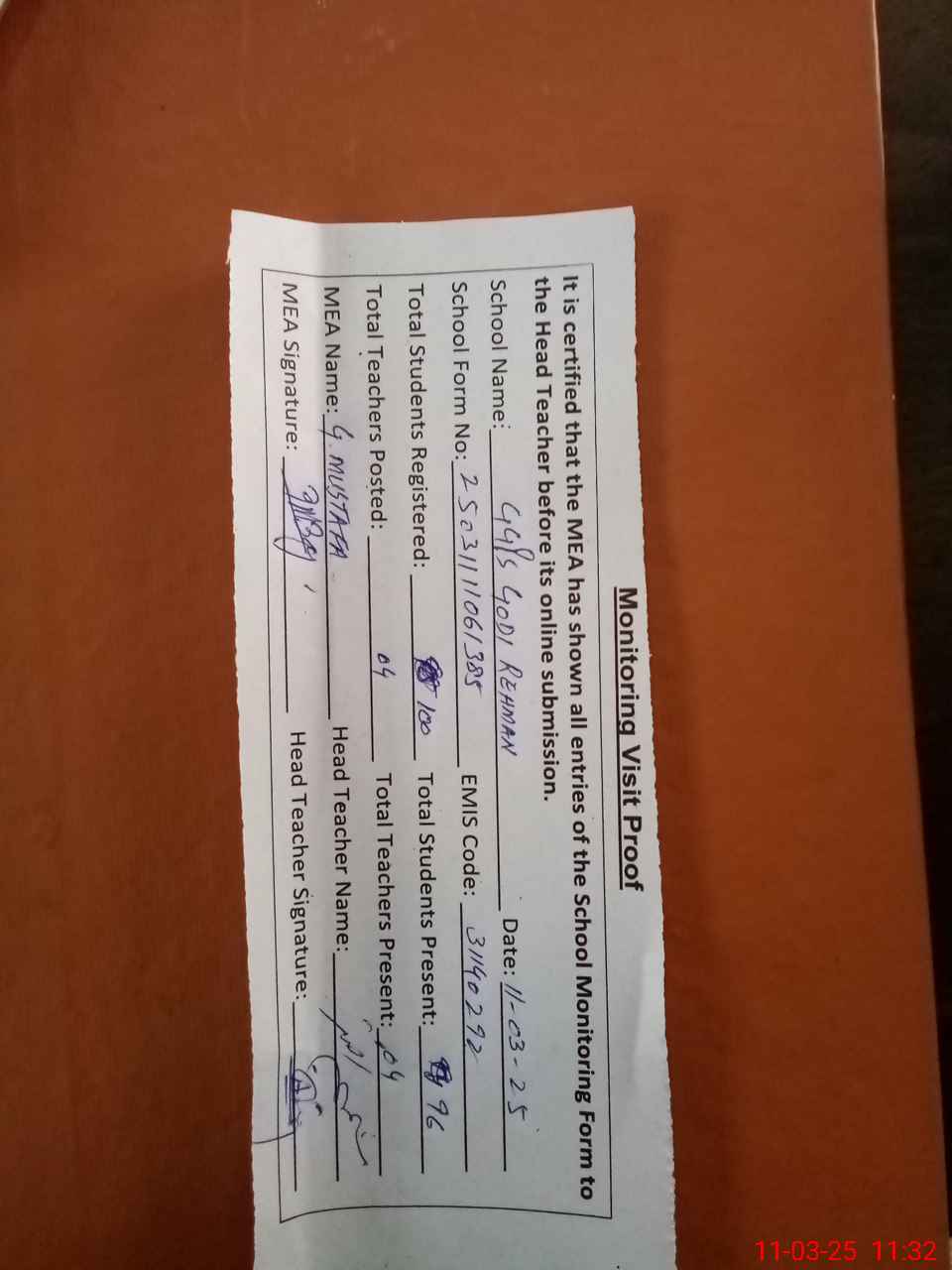 | Attendance Register | Head Teacher | MEA with School | Visit Proof |