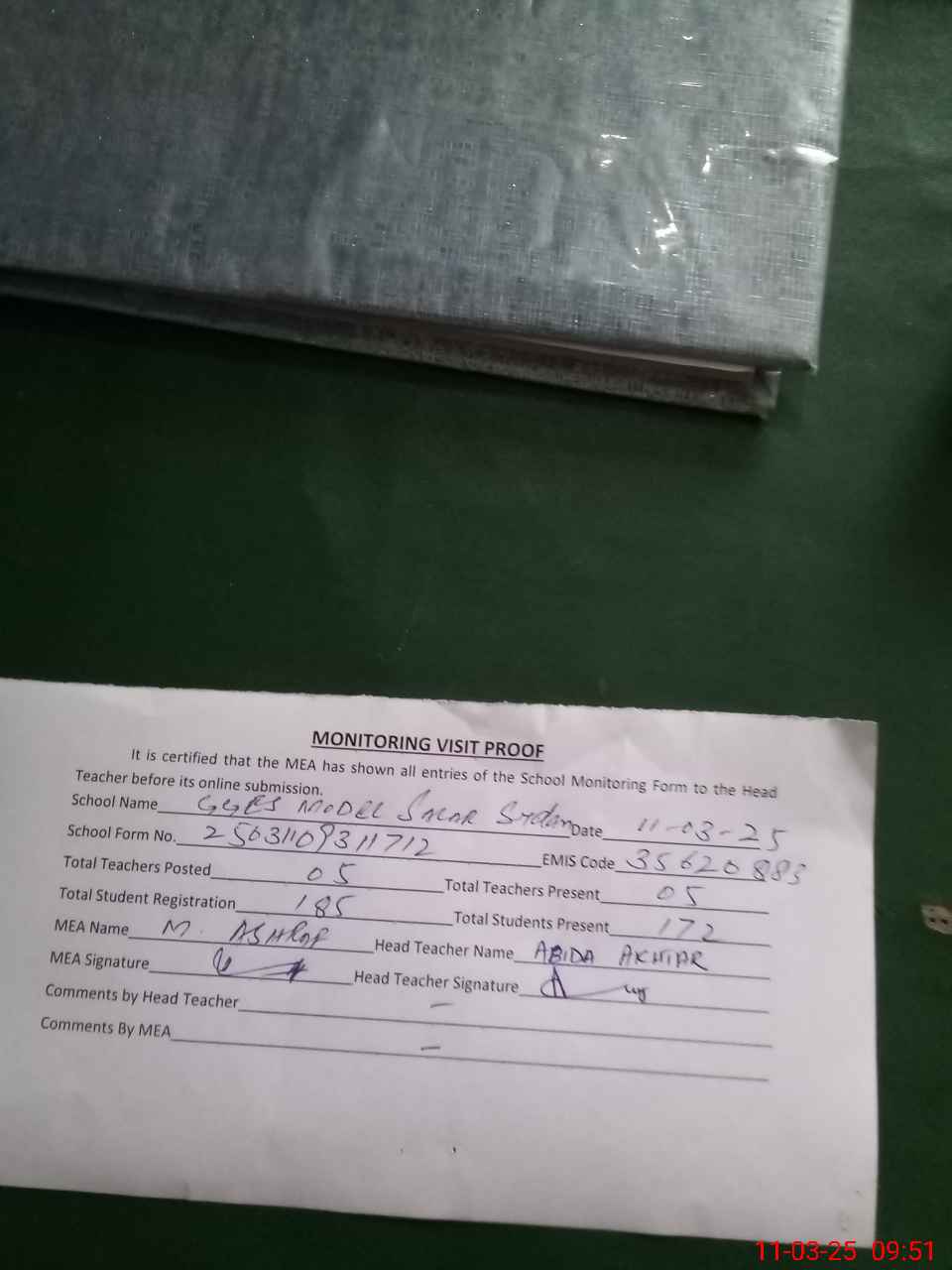 | Attendance Register | Head Teacher | MEA with School | Visit Proof |
