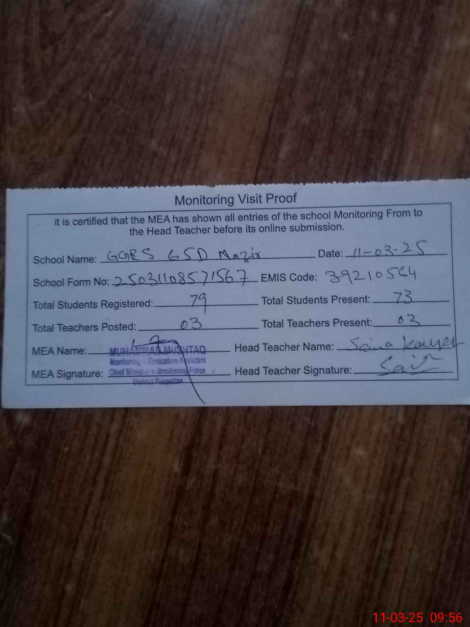 | EMIS Code: 39210564 | Name of School: GGES 65/D NAZIR | |||