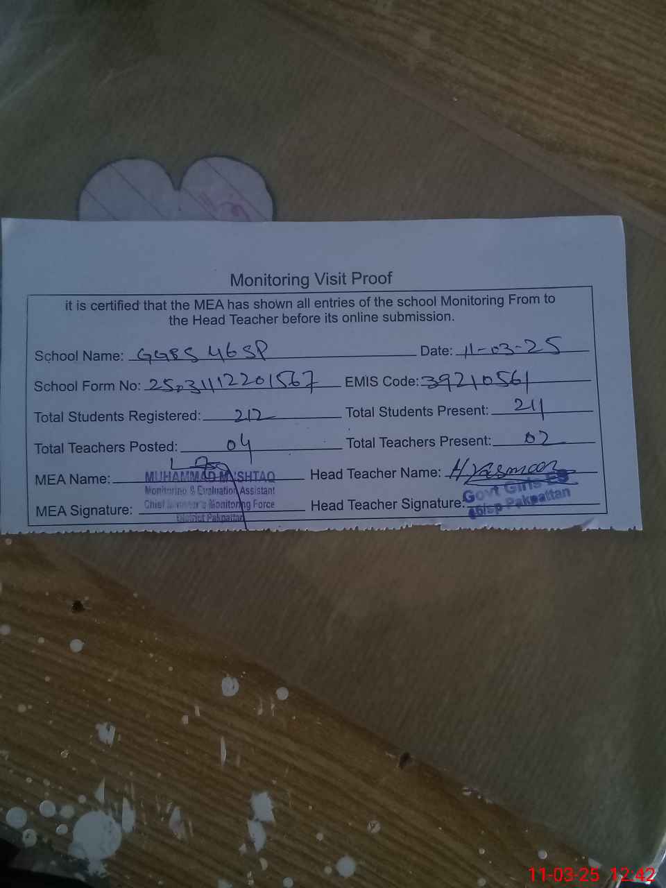 | Attendance Register | Head Teacher | MEA with School | Visit Proof |