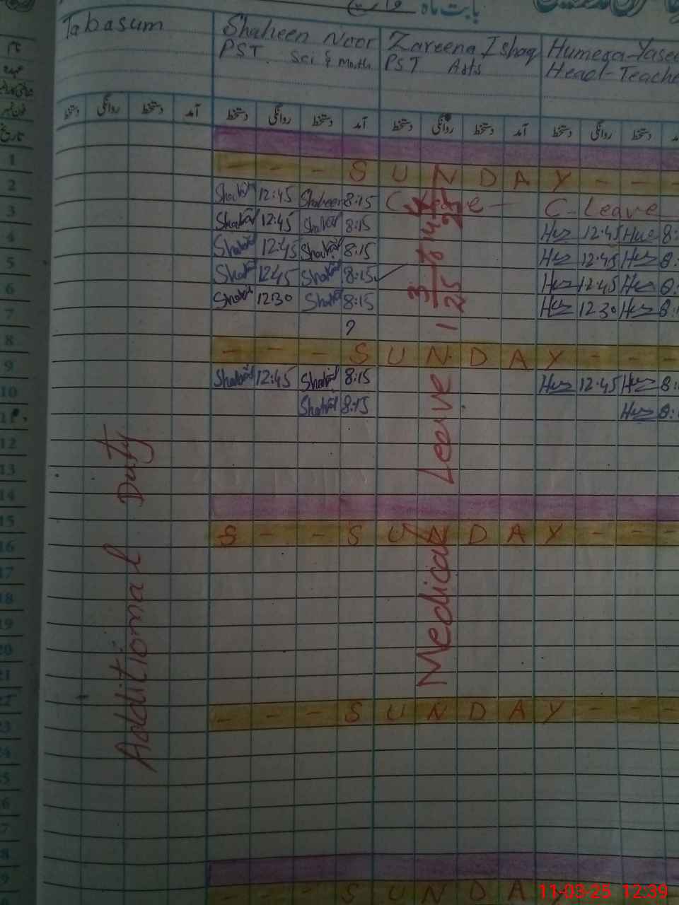 | Leave | Duty | Absent | Maternity | Medical | Ex- Pak |