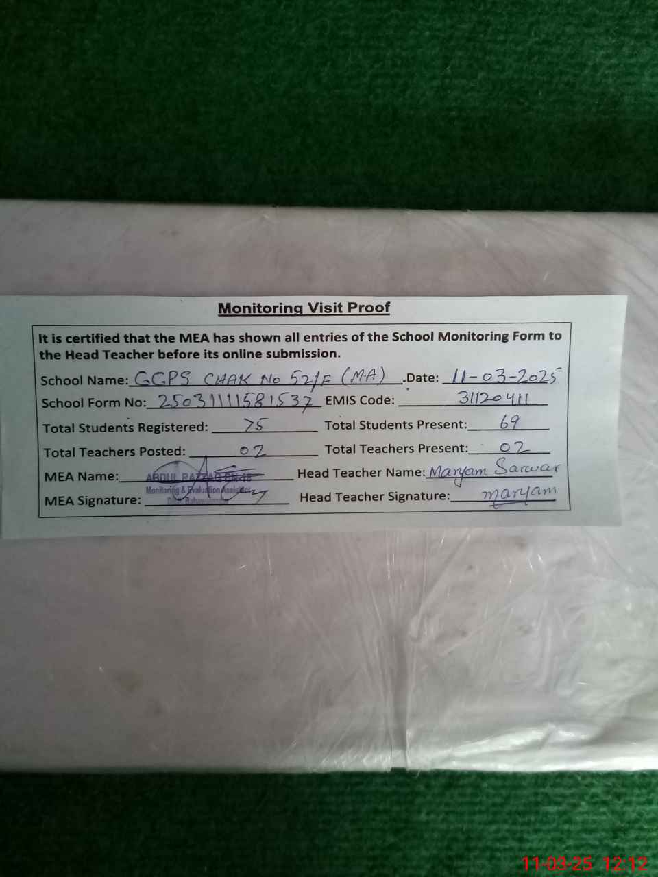 | EMIS Code: 31120411 | Name of School: GGPS CHAK NO. 52/F MASOOD ABAD, CHISHTIAN | |||