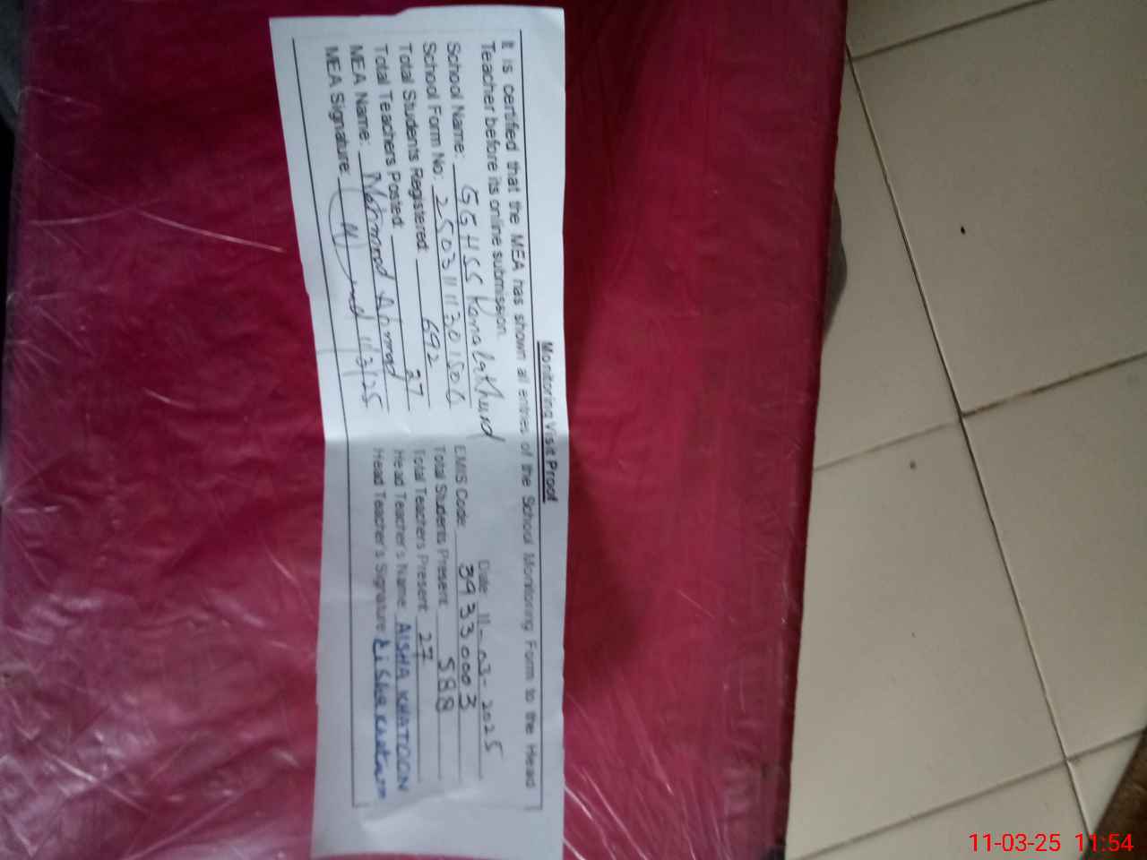 | Attendance Register | Head Teacher | MEA with School | Visit Proof |