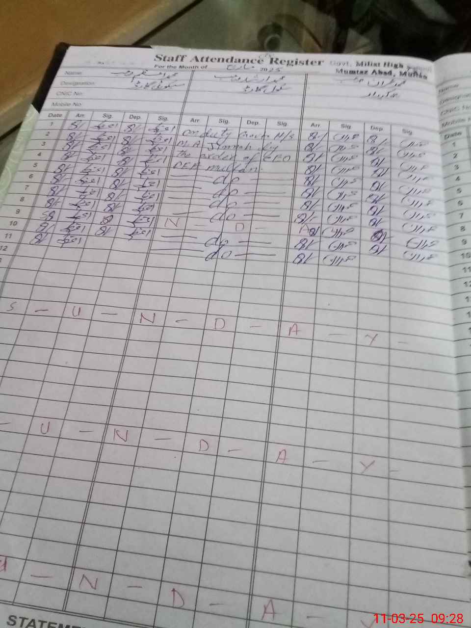 | CNIC | Full Name | Designation | R/C | Absence During Last Calender Month |