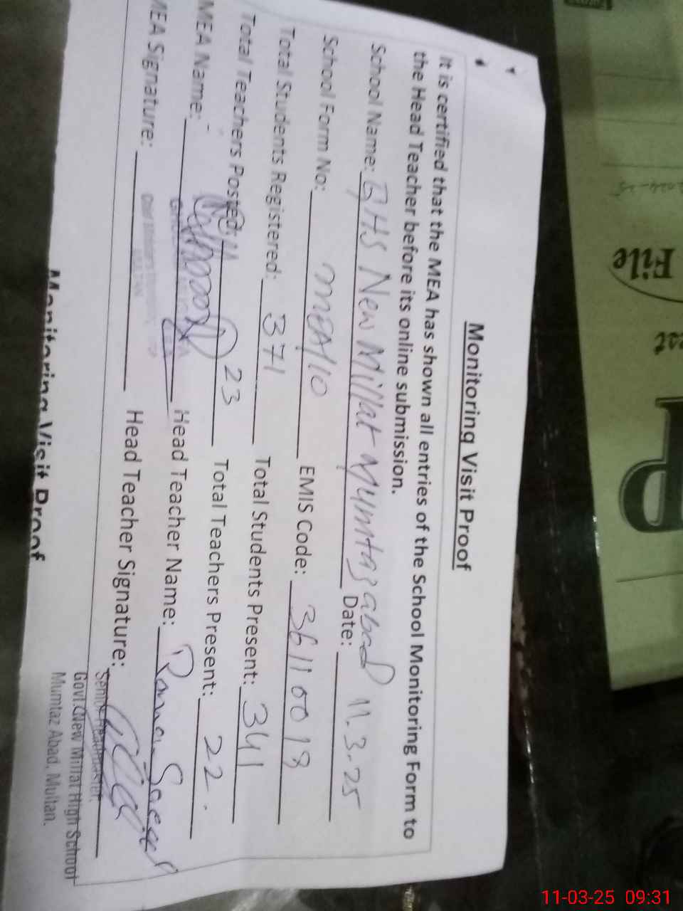 | Attendance Register | Head Teacher | MEA with School | Visit Proof |