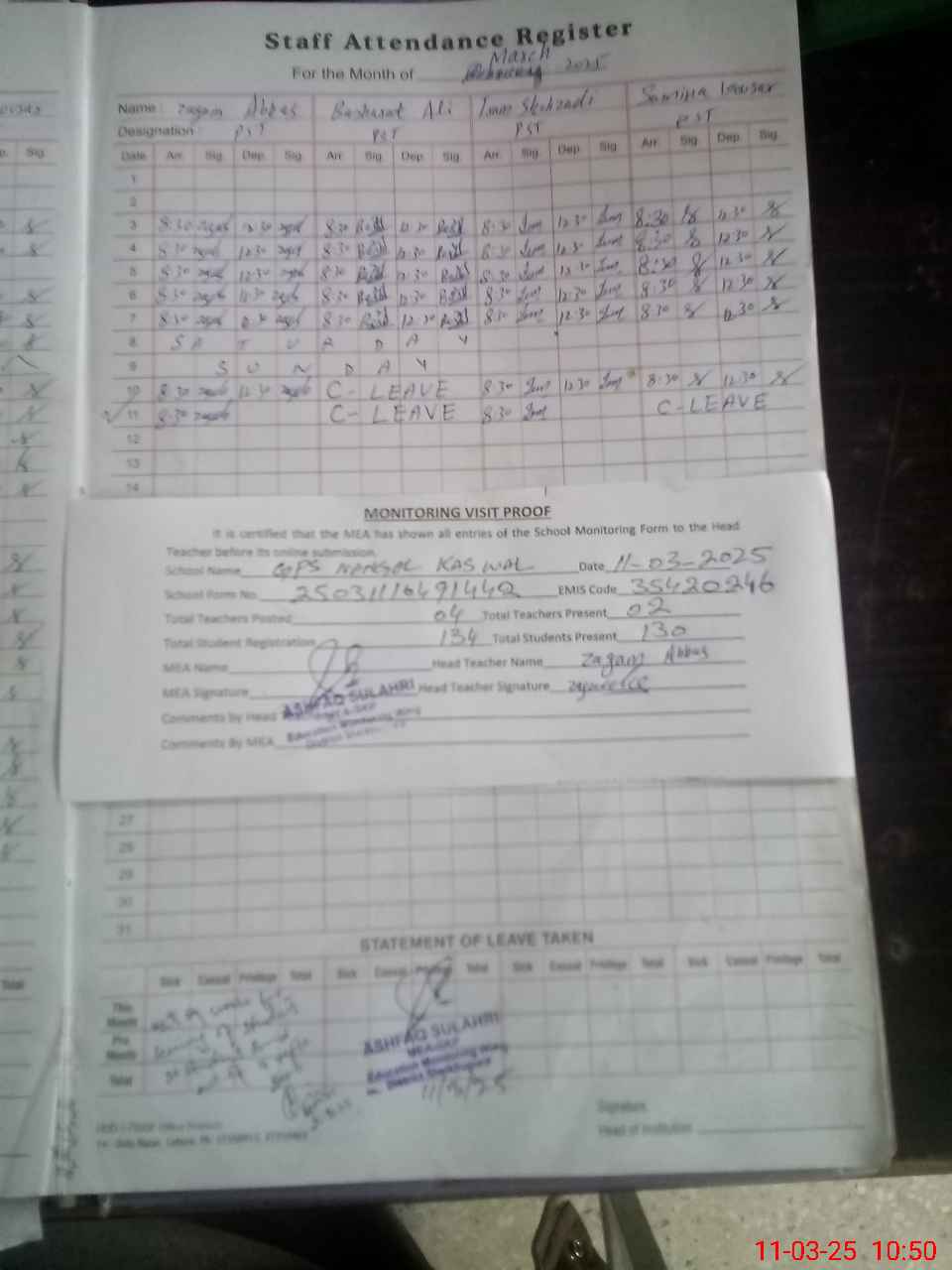 | Attendance Register | Head Teacher | MEA with School | Visit Proof |