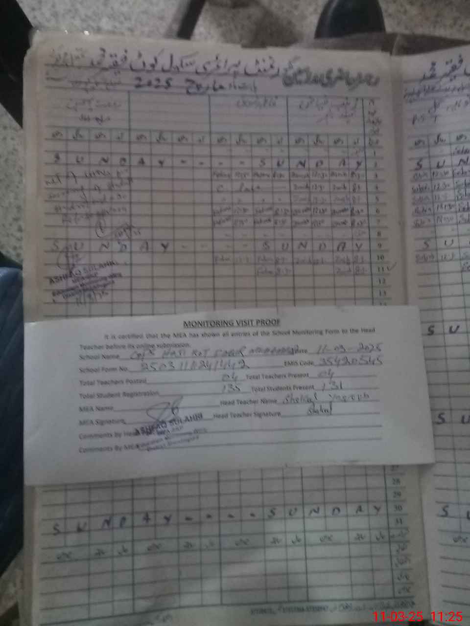 | Attendance Register | Head Teacher | MEA with School | Visit Proof |