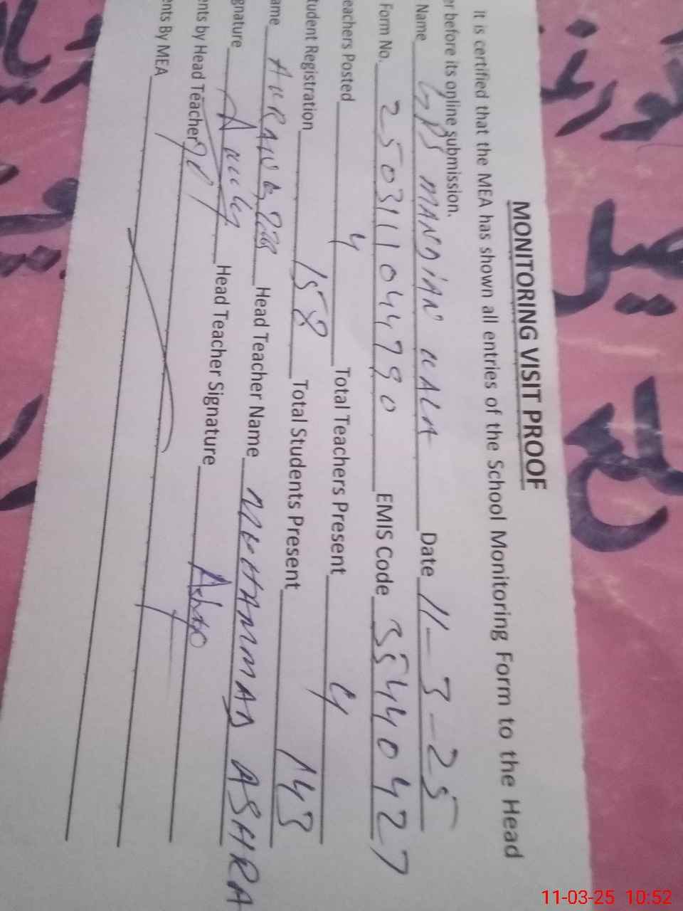 | Name: MU**** AS**** Designation: (School Headmaster's/Headmistress's) PTC/JV Phone/Cell Number: 03**** |