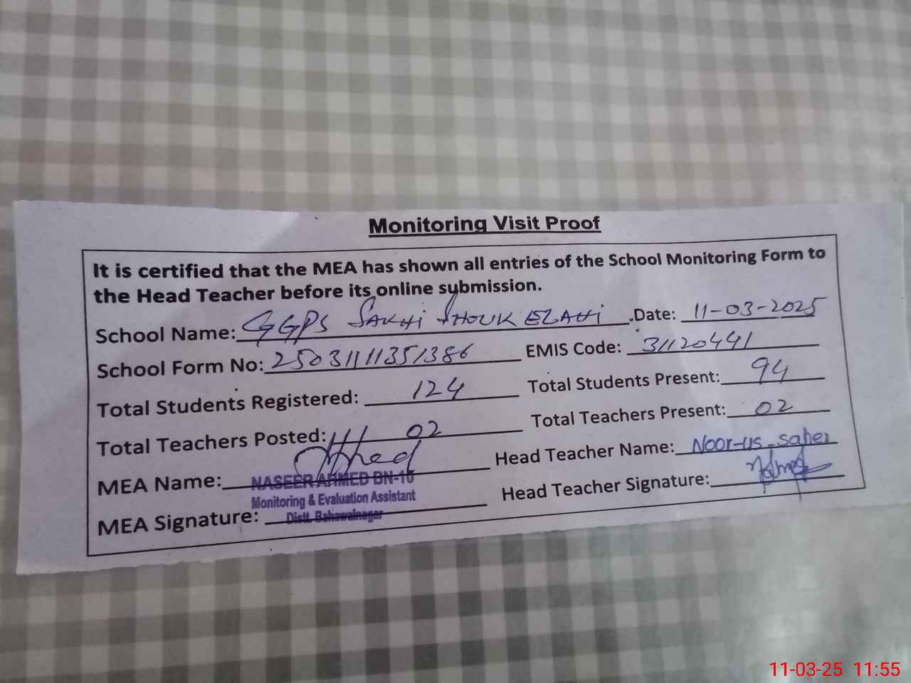 | EMIS Code: 31120441 | Name of School: GGPS SAKHI SHOUK ELAHI | |||