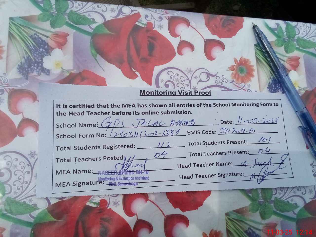 | EMIS Code: 31120210 | Name of School: GPS JALLAL ABAD | |||