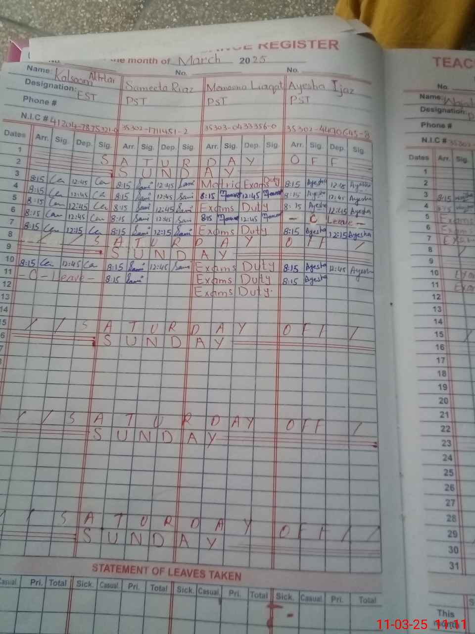 | 35**** | Wa**** Fa**** | PST | Regular | 2 | 0 | 0 | 0 | 0 | 0 | 0 | 0 | 2 | Exam Duty |