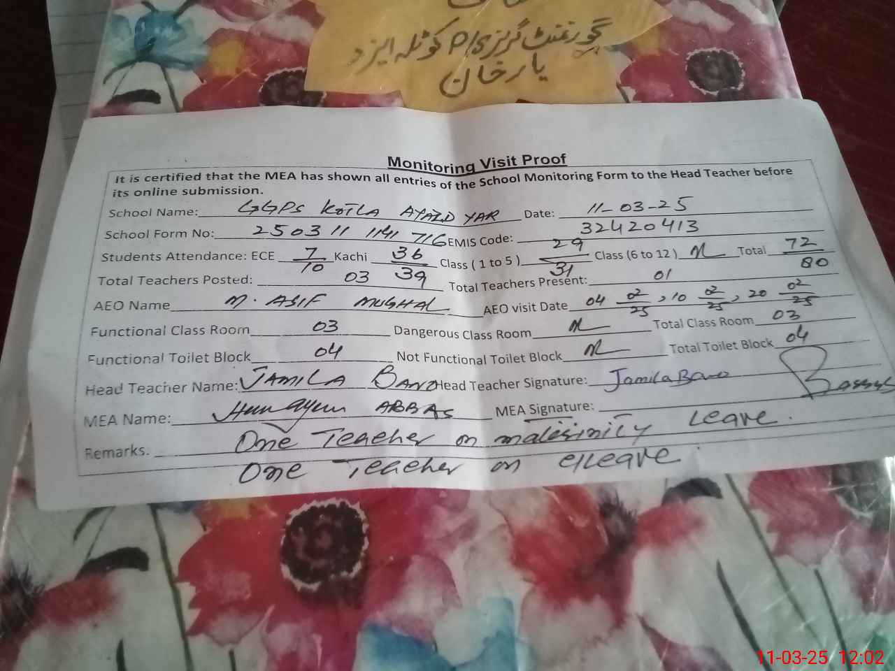 | EMIS Code: 32420413 | Name of School: GGPS KOTLA AIZAD YAR KHAN | |||