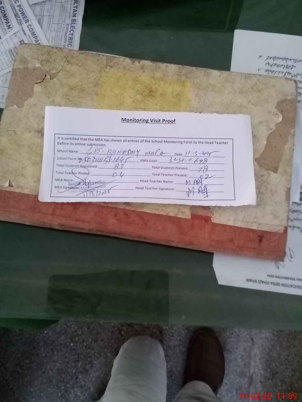 | Attendance Register | Head Teacher | MEA with School | Visit Proof |