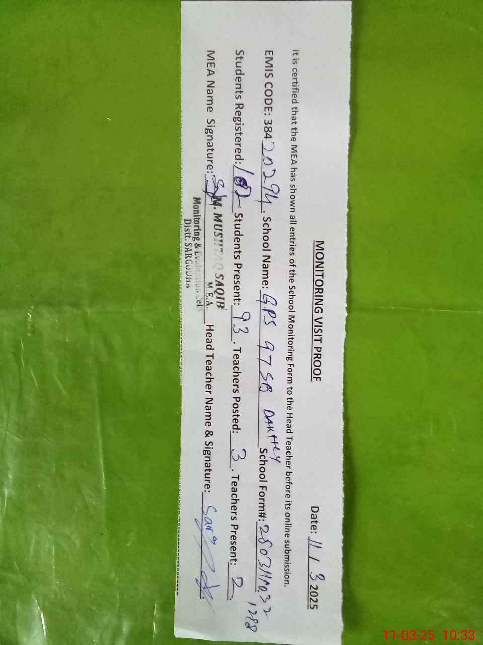 | EMIS Code: 38420294 | Name of School: GPS CHAK NO.97 SB (DAKHLI COLONY) | |||
