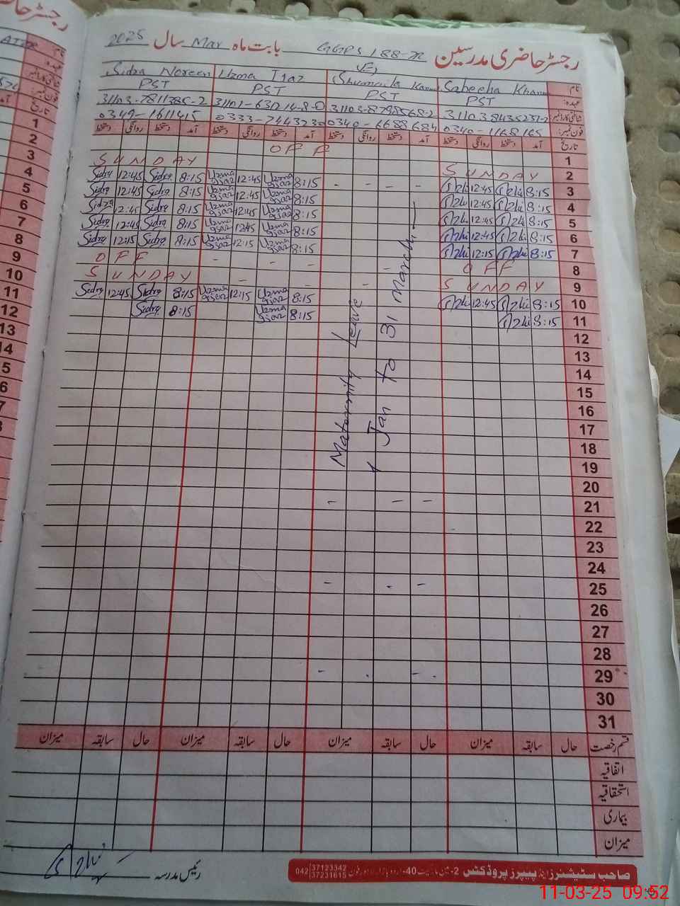 | 31**** | Sh**** Ka**** | PST | Regular | 28 | 0 | 0 | 28 | 0 | 0 | 0 | 0 | 0 | Maternity |
