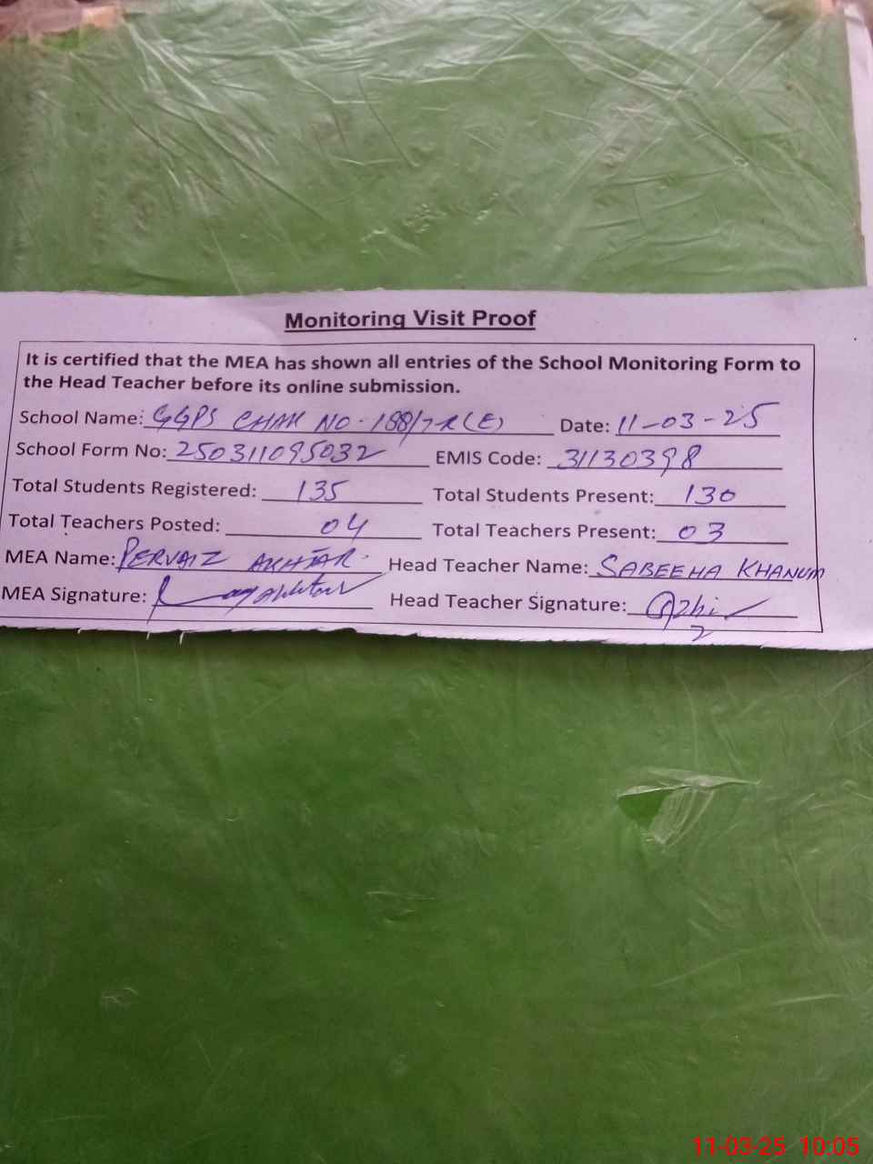 | Attendance Register | Head Teacher | MEA with School | Visit Proof |