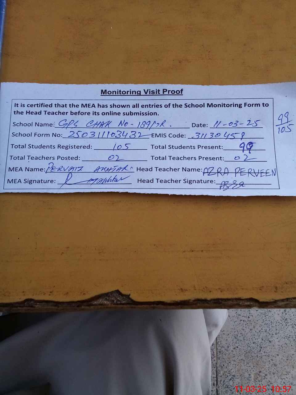 | Attendance Register | Head Teacher | MEA with School | Visit Proof |