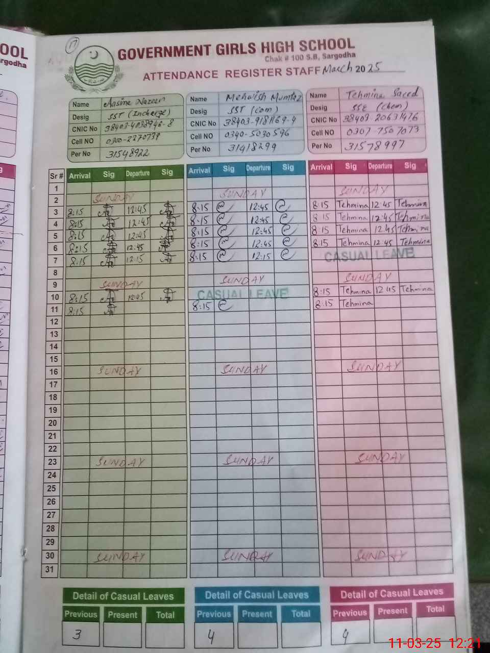| CNIC | Full Name | Designation | R/C | Absence During Last Calender Month |