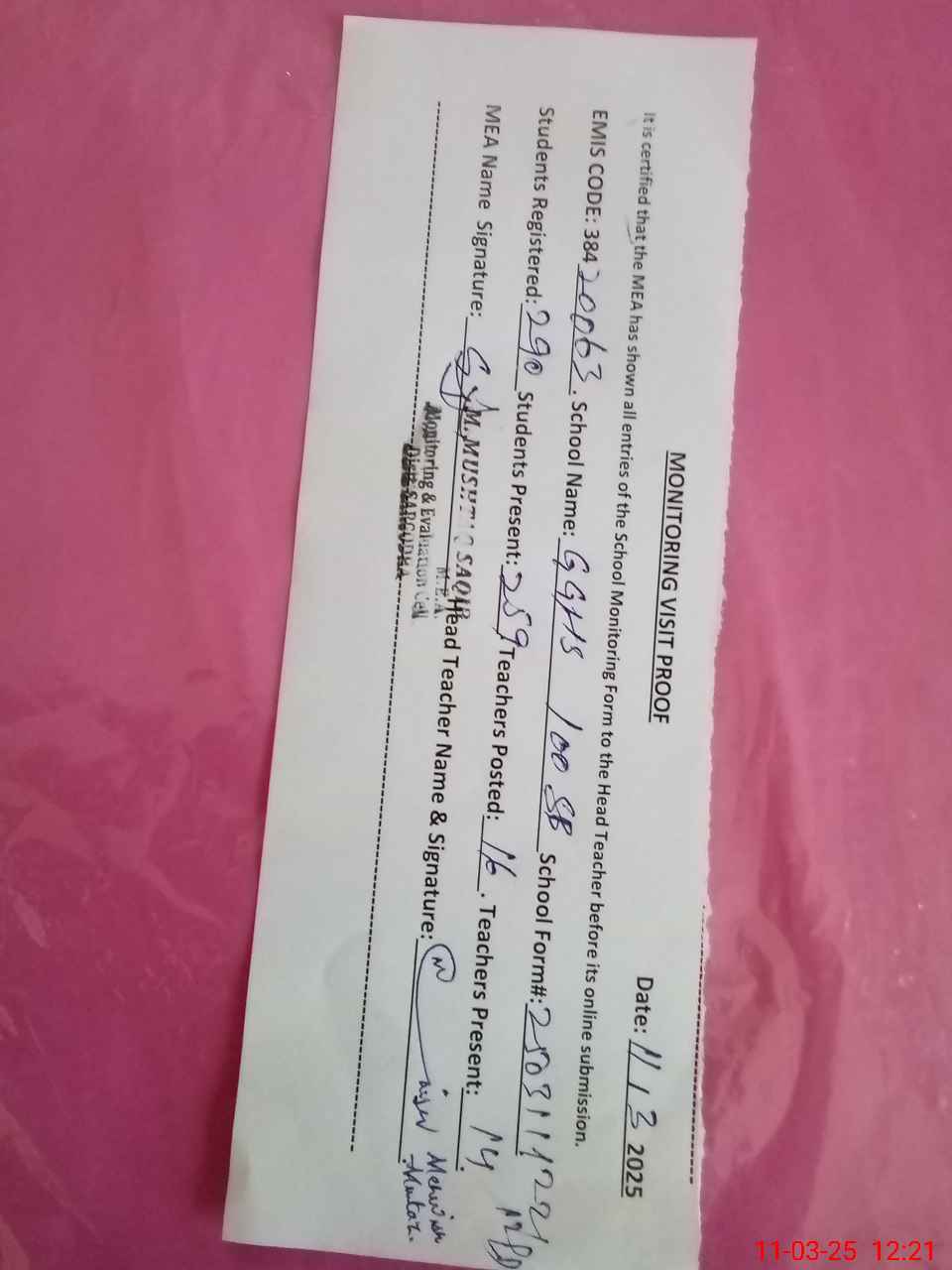 | Attendance Register | Head Teacher | MEA with School | Visit Proof |