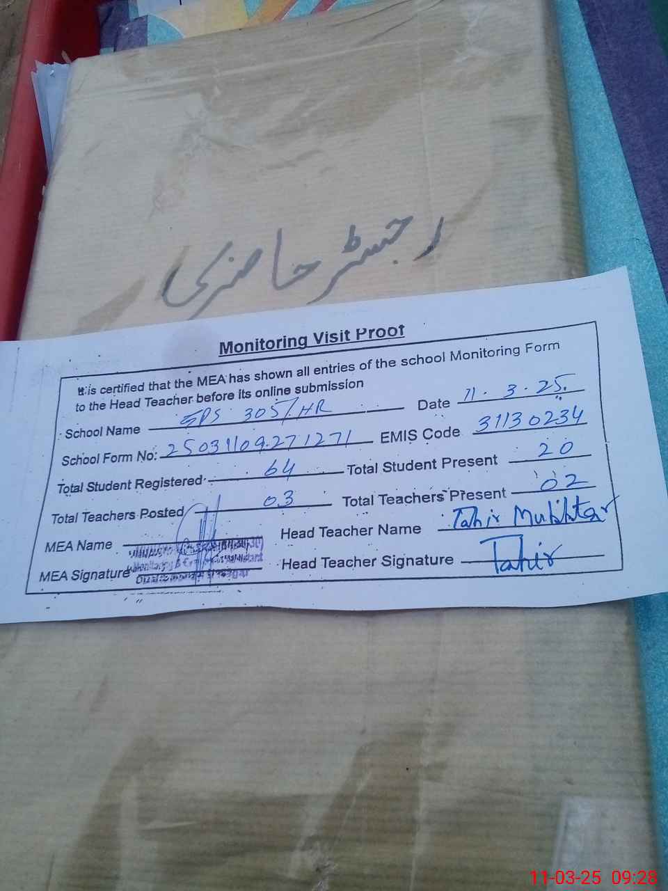 | EMIS Code: 31130234 | Name of School: GPS CHAK NO 305 HR | |||