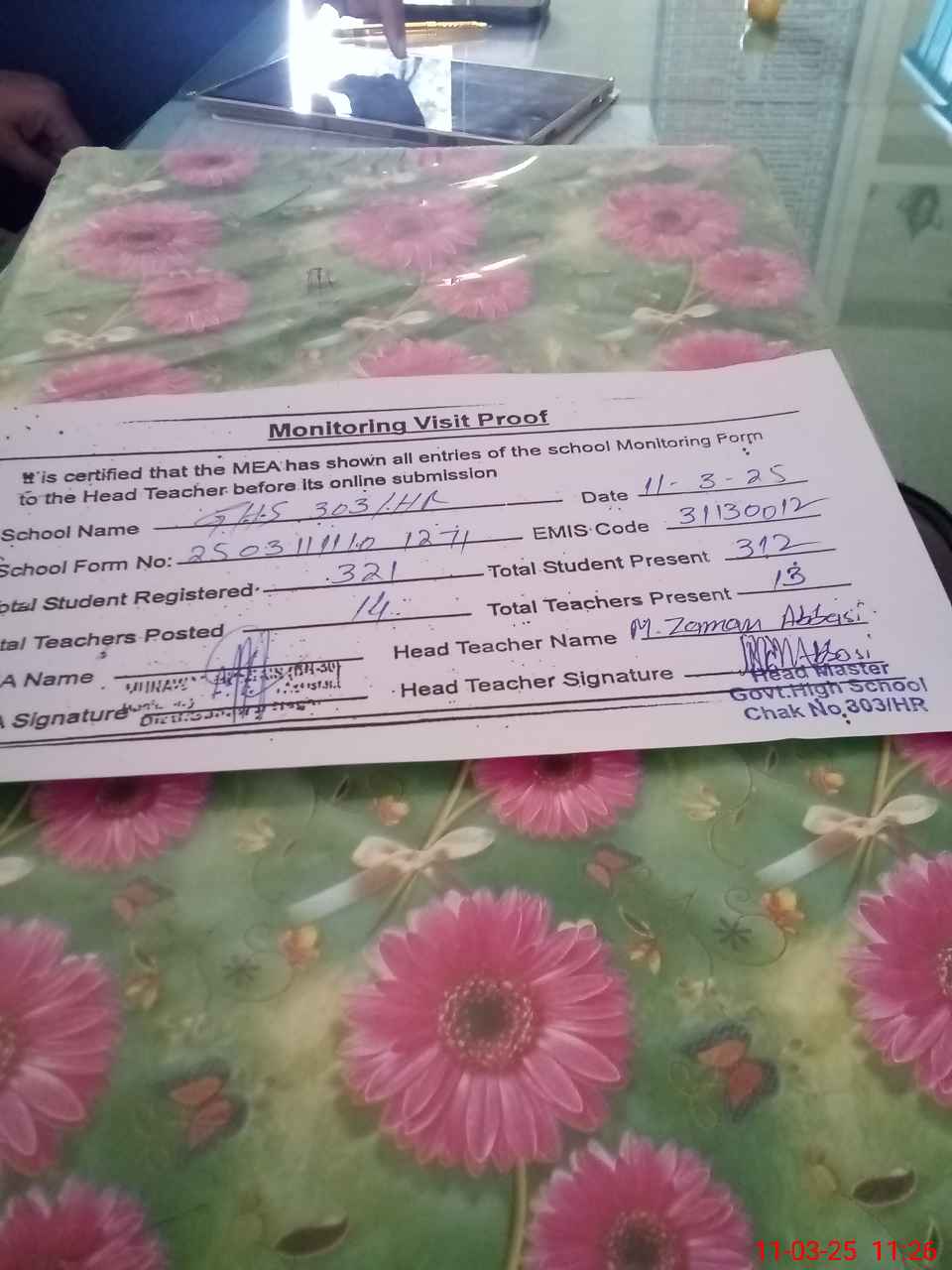 | Attendance Register | Head Teacher | MEA with School | Visit Proof |