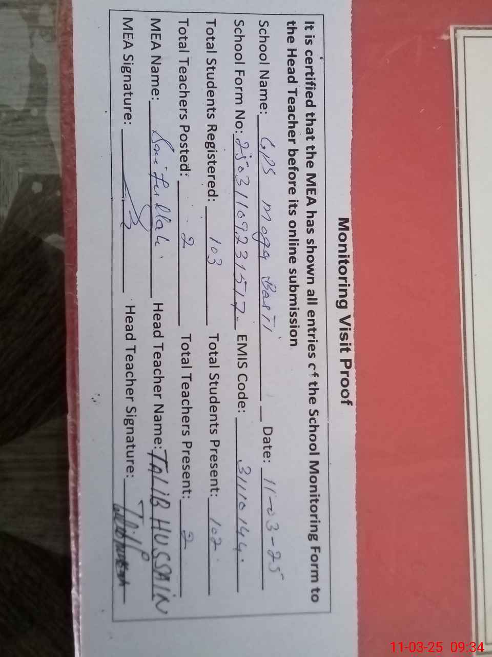 | Certified that this School was Inspected by the Undersigned MEA/DMO Today and the Information Stated Above is as Per Record. | |||||