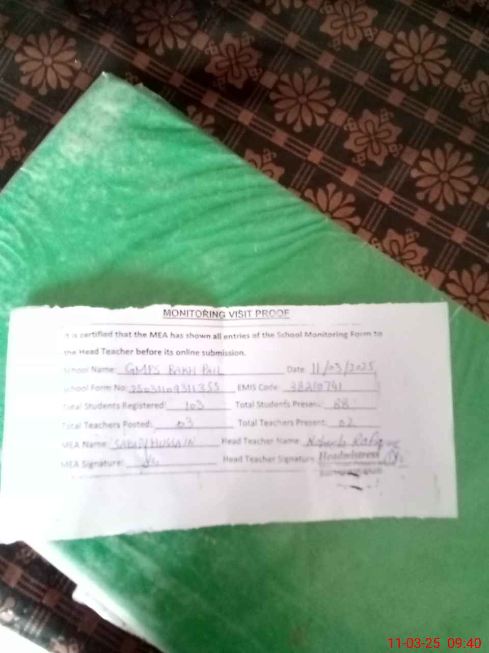 | Attendance Register | Head Teacher | MEA with School | Visit Proof |
