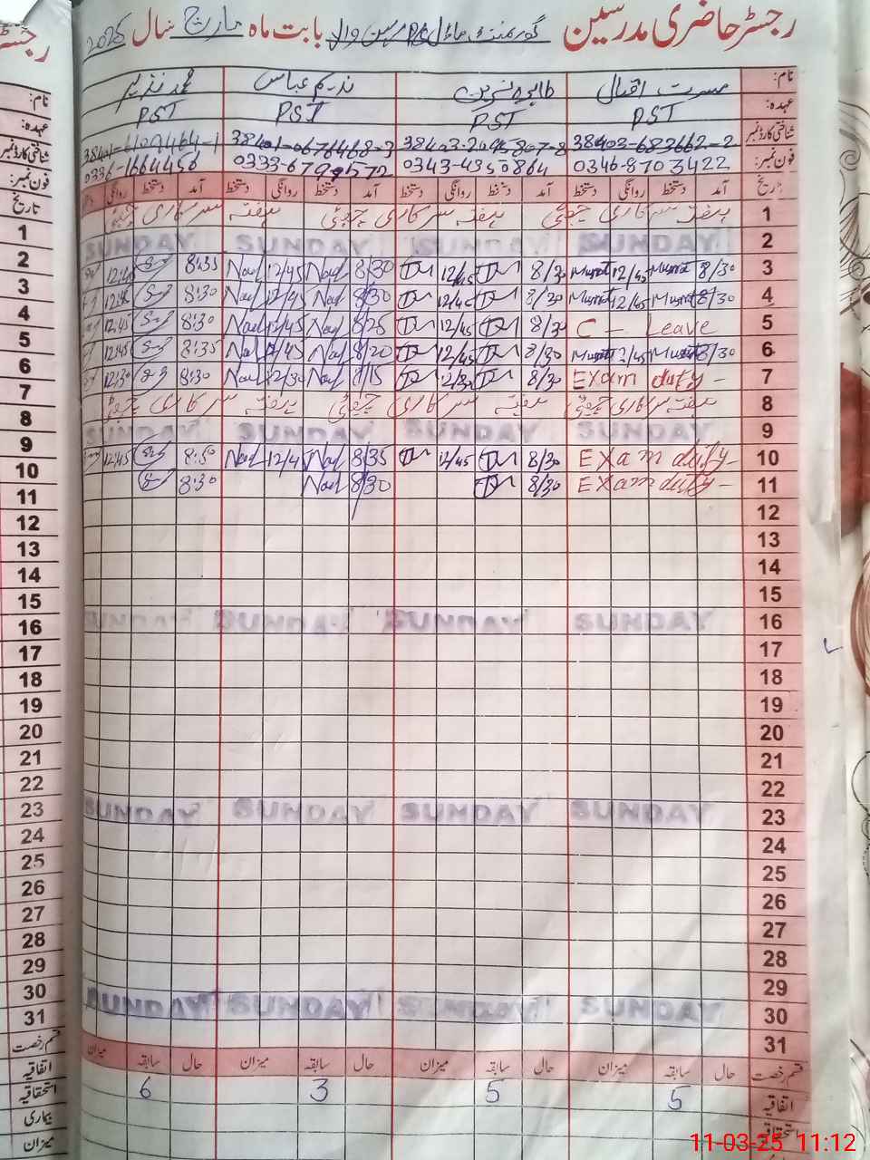 | 38**** | Mu**** Iq**** | PST | Regular | 0 | 0 | 0 | 0 | 0 | 0 | 0 | 0 | 0 | Exam Duty |