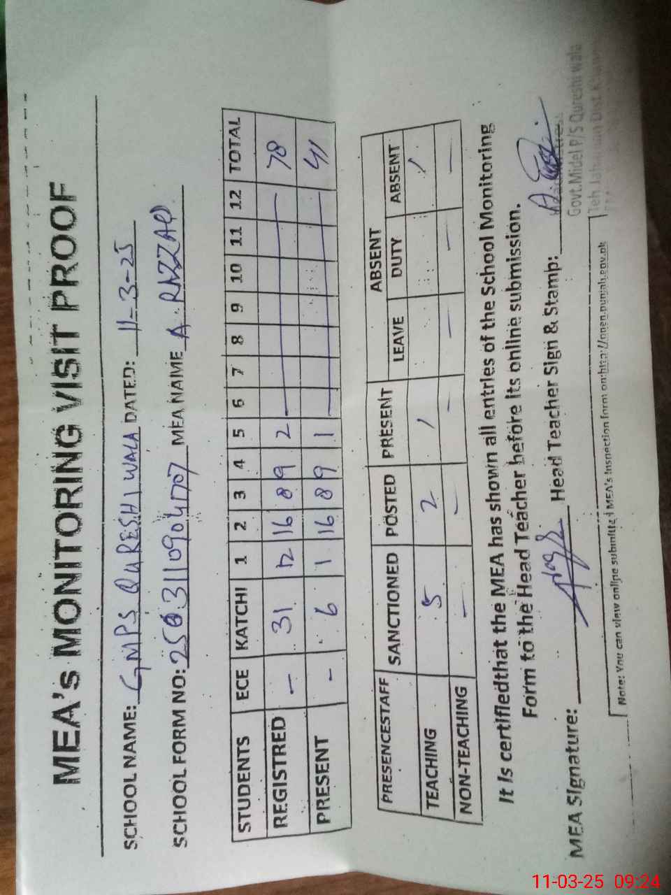| Attendance Register | Head Teacher | MEA with School | Visit Proof |