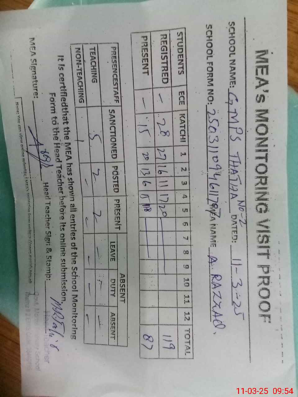| Attendance Register | Head Teacher | MEA with School | Visit Proof |