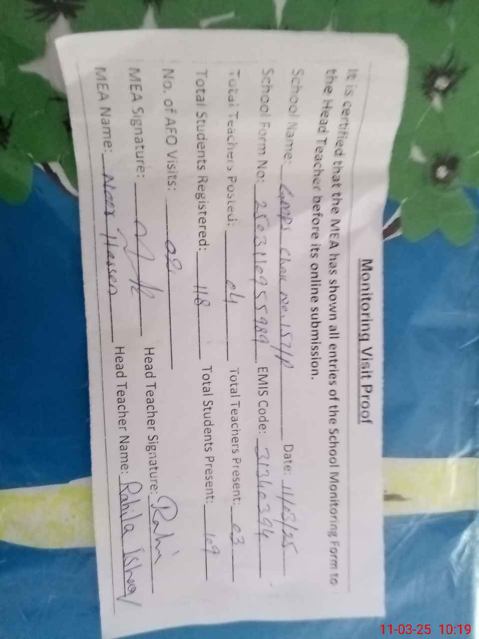 | Attendance Register | Head Teacher | MEA with School | Visit Proof |