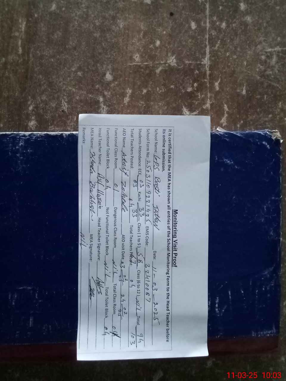 | Attendance Register | Head Teacher | MEA with School | Visit Proof |