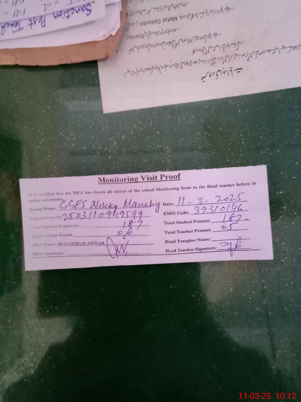 | Certified that this School was Inspected by the Undersigned MEA/DMO Today and the Information Stated Above is as Per Record. | |||||