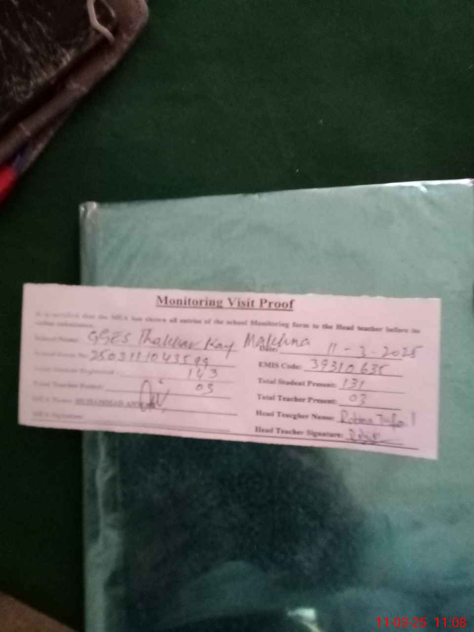 | Attendance Register | Head Teacher | MEA with School | Visit Proof |