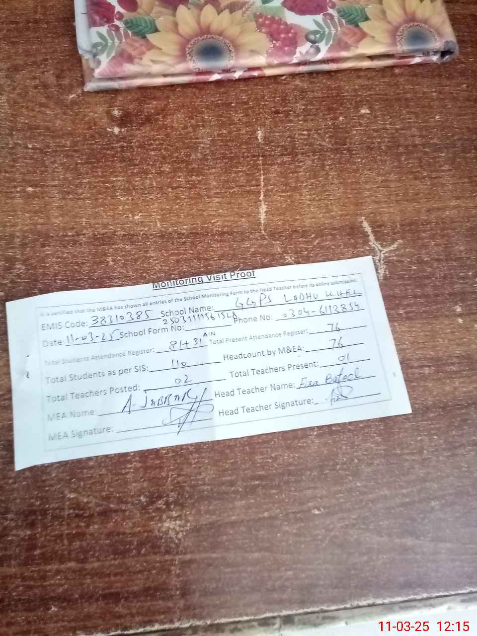 | Attendance Register | Head Teacher | MEA with School | Visit Proof |