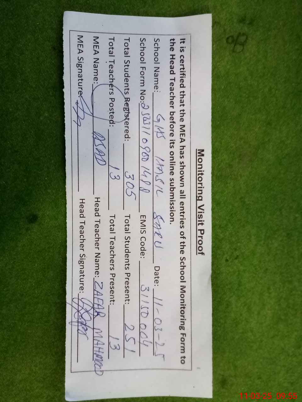 | Attendance Register | Head Teacher | MEA with School | Visit Proof |