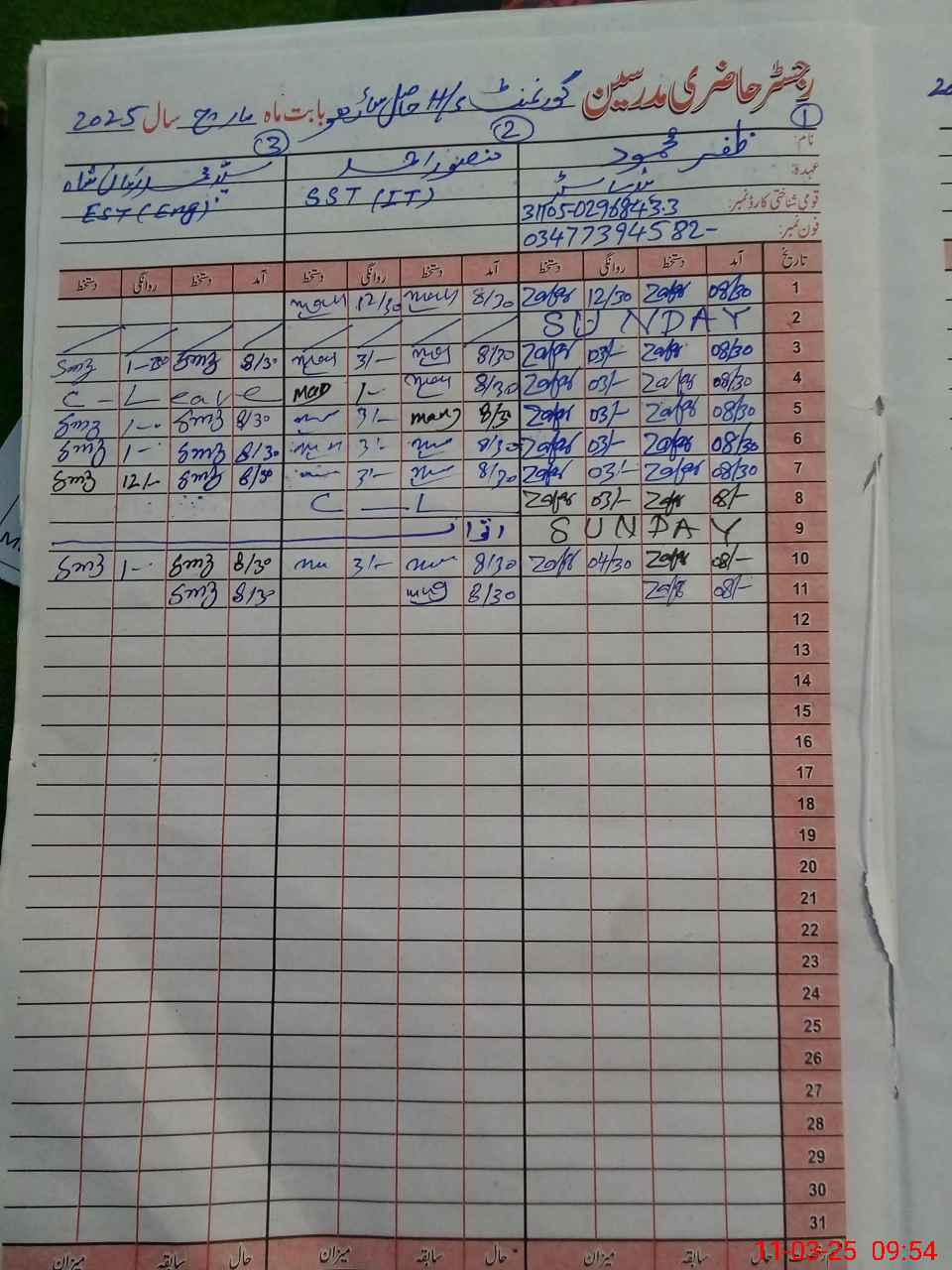 | CNIC | Full Name | Designation | R/C | Absence during last cal. month |
