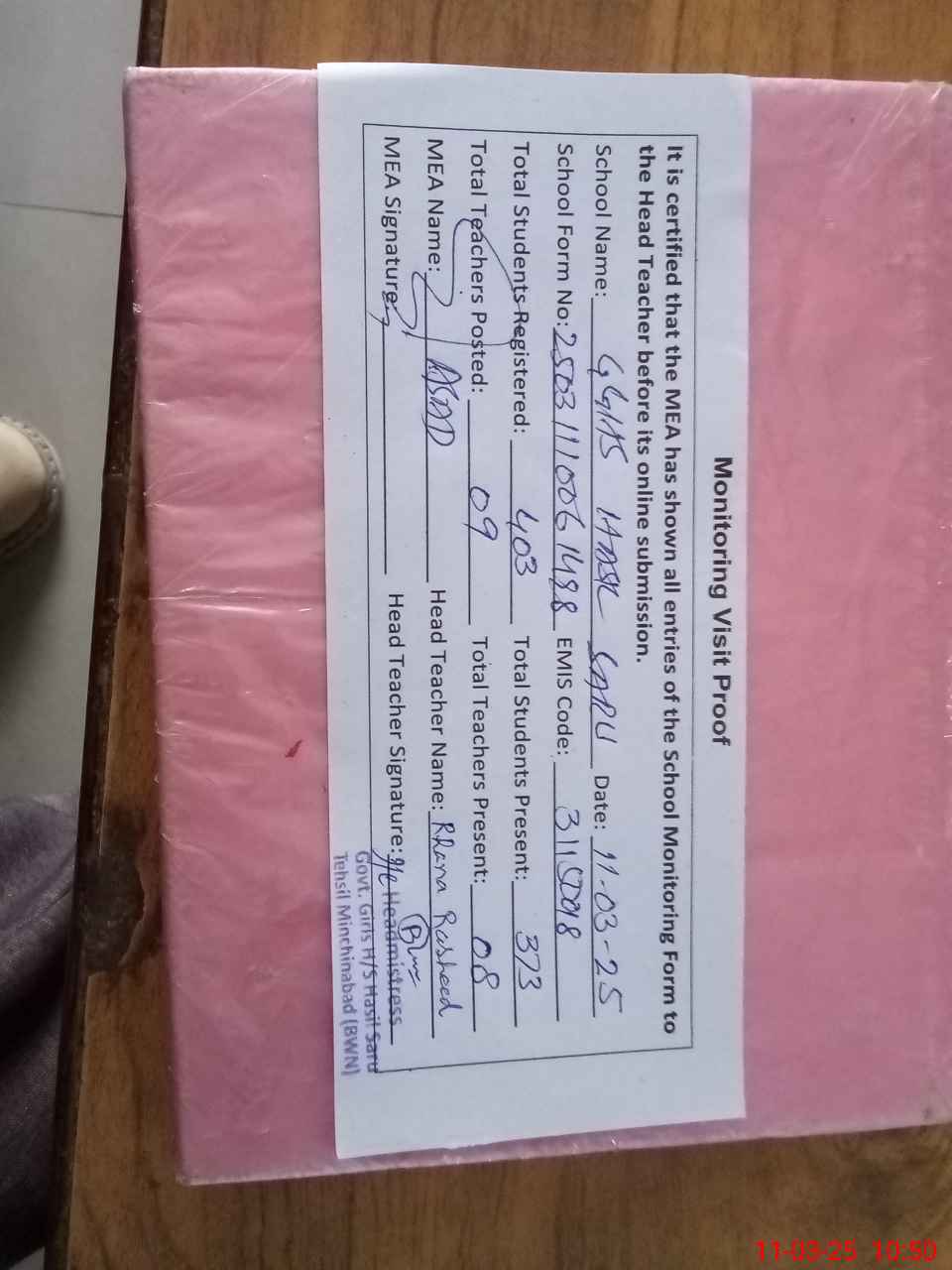 | Certified that this School was Inspected by the Undersigned MEA/DMO Today and the Information Stated Above is as Per Record. | |||||